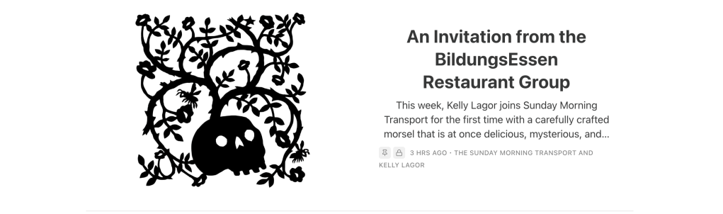 I have new fiction in the world today! My latest short story “An Invitation from the BildungsEssen Restaurant Group” is live at the wonderful Sunday Morning Transport! It is subscribers only, but you can check out two months free with this link. Many thanks to Fran Wilde, Curtis Chen, and Eric Brooks for their feedback on this one.