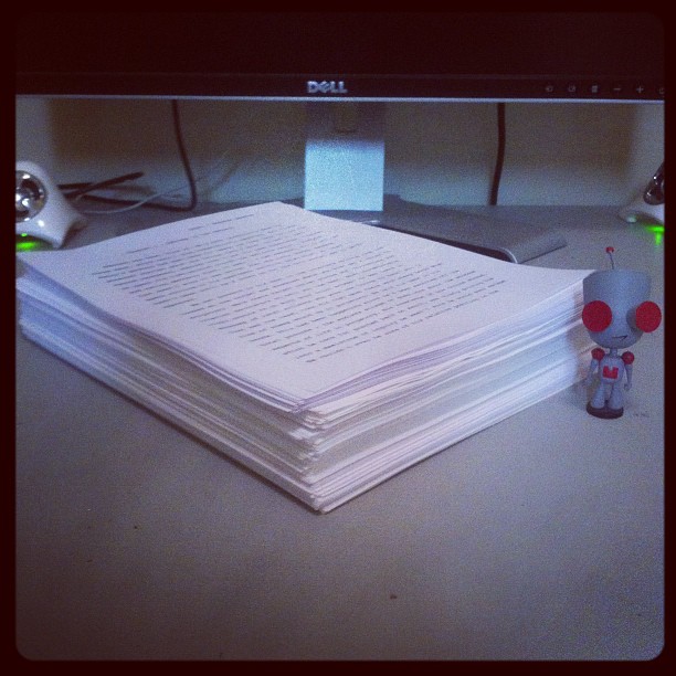 But damn it feels good. Four years of sitting in my head, waiting to be written. Two drafts, the first incomplete at 80,000 words, and now a second first draft finished at a hair over 100,000. I was so proud of myself for keeping that promise that I printed the whole thing out, just so I could look at it.